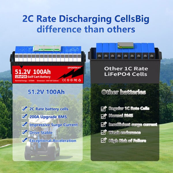 Designed specifically for golf carts, the SPIDERWAY 51.2V 100Ah golf cart battery keeps your golf cart moving around the course round after round. Whether accelerating down a steep hill or unleashing powerful torque, golfers will experience the extraordinary with the SPIDERWAY 51.2V 100Ah golf cart lithium battery.